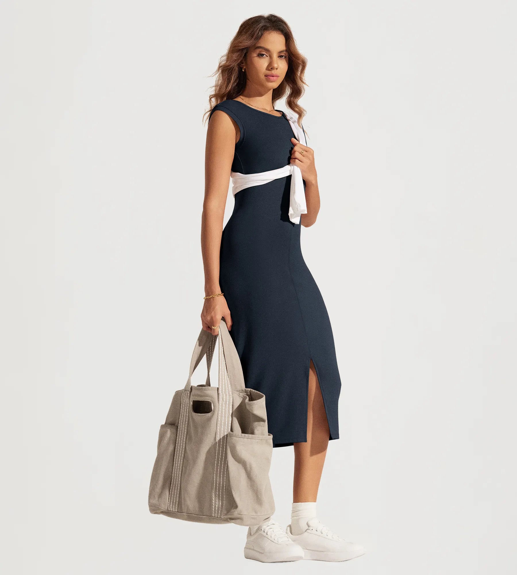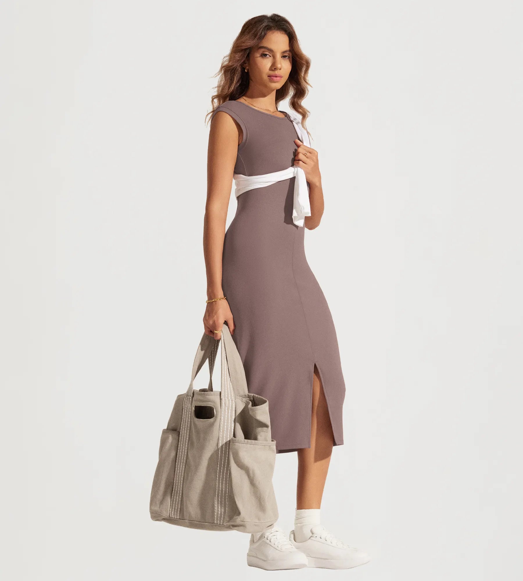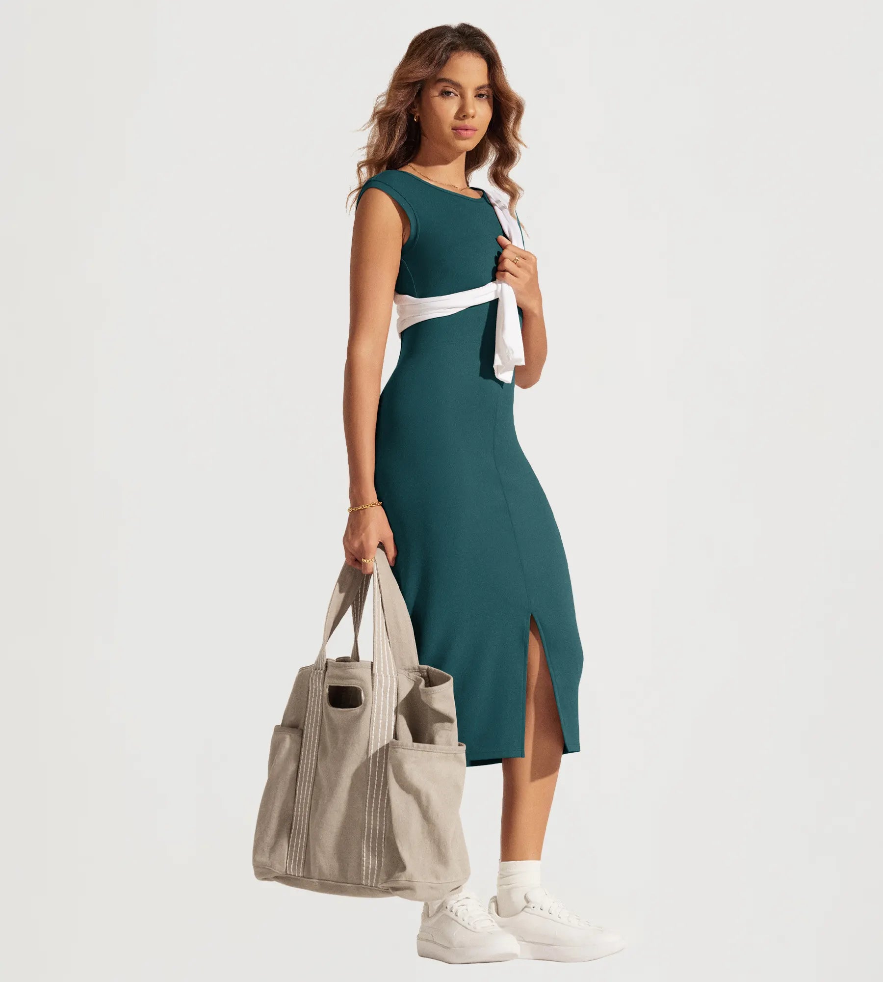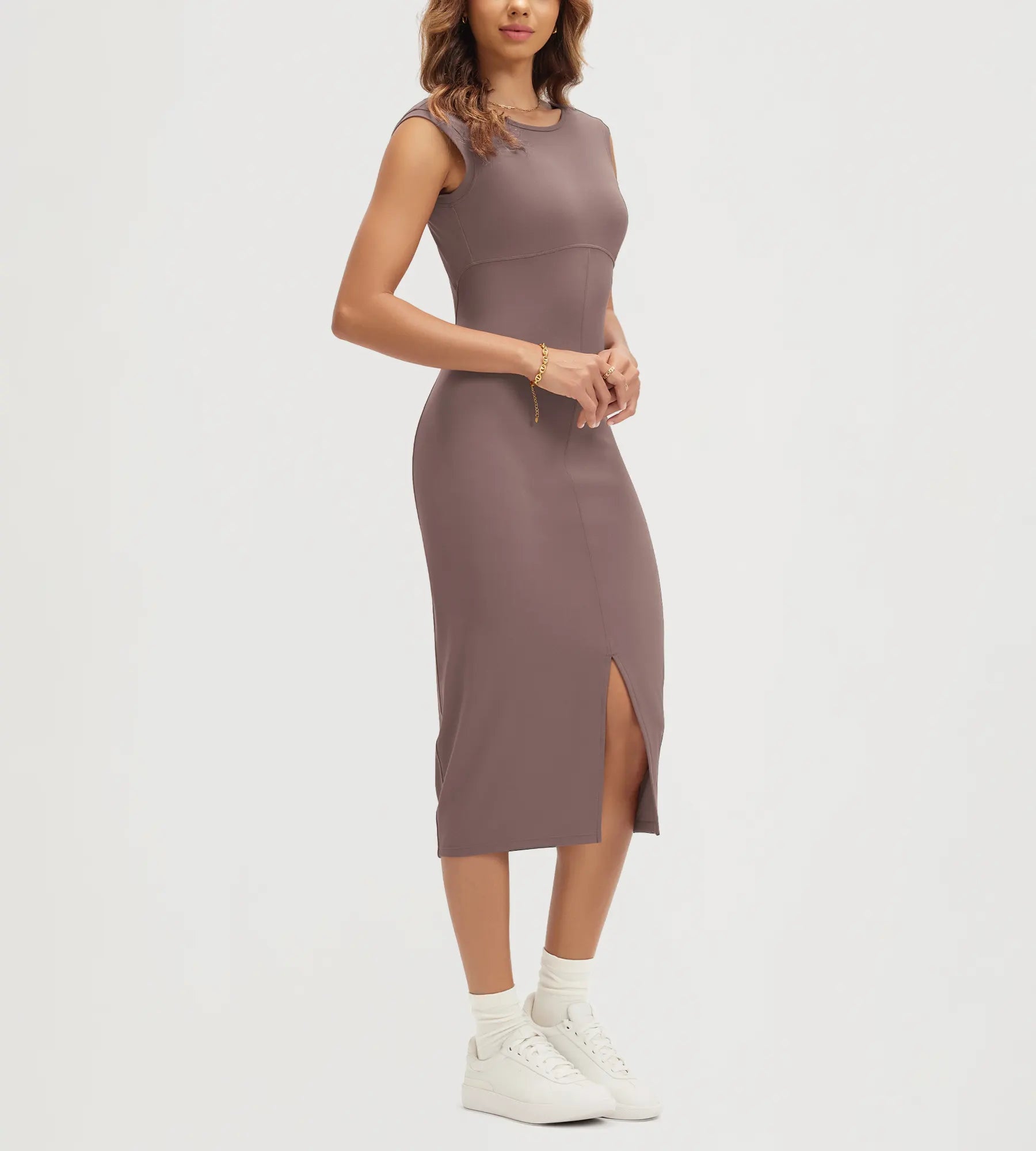ODODOS Women's Front Split Midi Bodycon Tank Dress Square Back Crew Neck